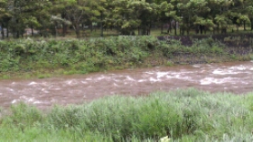昼間雨が強く降ったので、川が濁りました。午後6時50分現在、水位は50センチ以上高く、川の中にある石が見えない状態です。